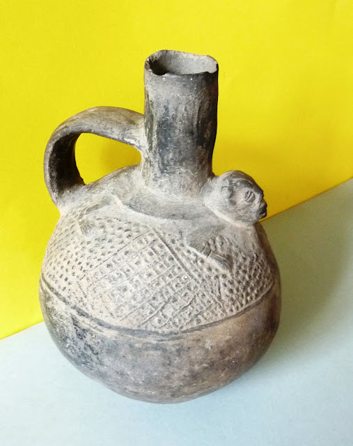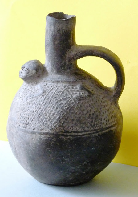 Three views of an Ancient Peruvian pot 8 inches high made in dark brown clay with monkey like creature at base of spout and incorporated into curved over handle.
