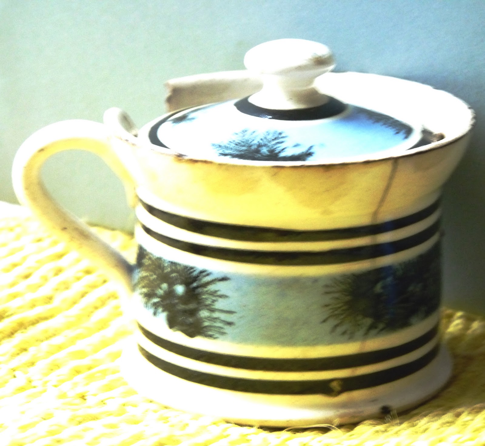 English mochaware mustard pot c1830 with 'seaweed' designs on pale blue band.