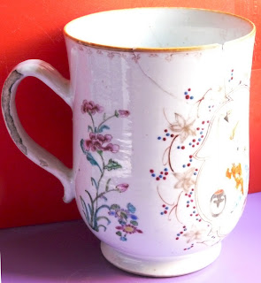 This is an 18th century Chinese porcelain tankard, about 6" high, painted in polychrome, of the Qianlong period 1736 - 1795. It was made for export, probably for the English market, for drinking beer.