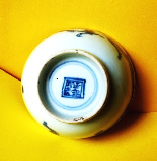 1. 18th century Chinese blue and white tea bowl, view of base showing painter's or Emperor's mark. |