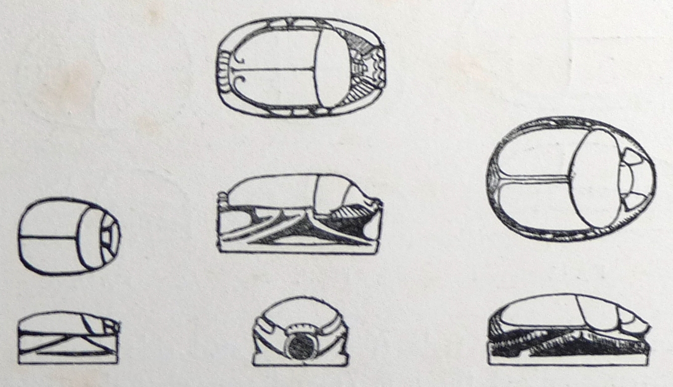 Through about 3000 years scarabs became many and varied, they were used as seals, jewellery, talismen, grave goods, gifts of affection, and currency, etc. They were generally made from steatite (stone) which was glazed with a blue glass-glaze,and some of the earliest ones from ivory. Under later dynasties they were made from faience, carnelian, yellow jasper, lapis, amethyst and other hard stones. In Greece seal -scarabs went on being made for some time but in Egypt they seem to disappear suddenly at the close of the XXVIth dynasty. Nowadays many forgeries of scarabs are made, and it is sometimes difficult to distinguish between these and the genuine article.