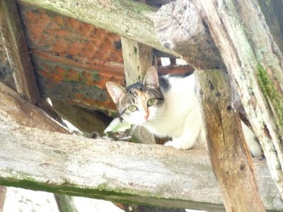 This is a French cat called Fortune. She doesn't catch birds APPARENTLY, though she's climbed up, just to get a good look from on high? A cat may look at a king I suppose. Her eyes are magnificent completely surrounded with black kohl pencil!