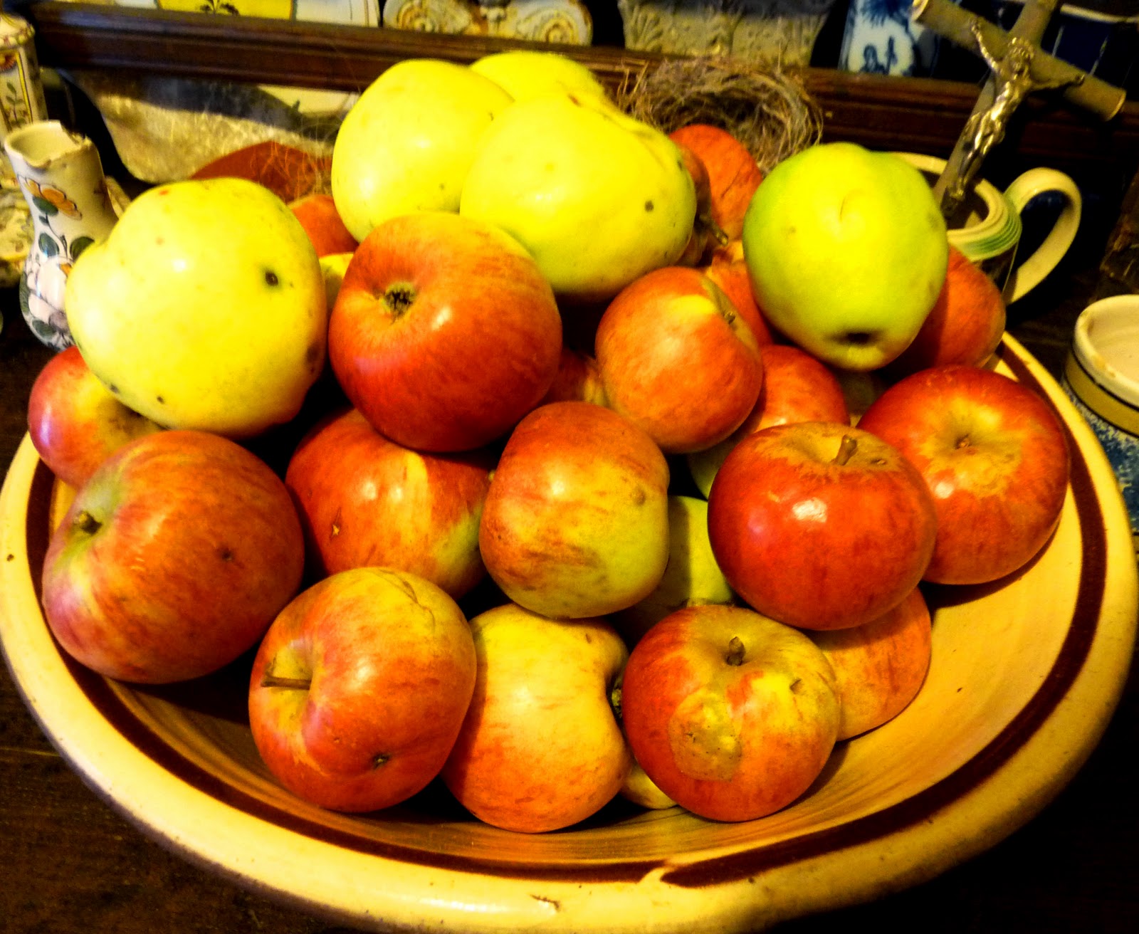 A variety of windfall apples, some for eating and some for cooking. These apples would be unacceptable in a super market, just too varied in shape, and with various blemishes that wouldn't suit the 'perfect' specimens they insist on selling. In fact, these misshapen marked apples taste best. |