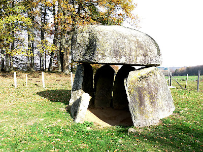 | The Dolmen, St.Priest la Feuille France, is set in the magnificent Creuse countryside with Limousin cattle grazing nearby. The dolmen sends a strong shadow and the top stone rests on only 3 stones. Probably a tomb, it stands on a hill with a standing stone nearby. The supporting standing stones may have moved over the many years and a front stone is broken. It is magnificent, particularly from a distance. |