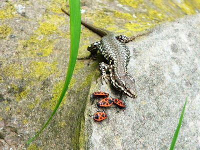 A striped snail, French lizards, and Irises - a painting by Tessa bennett.