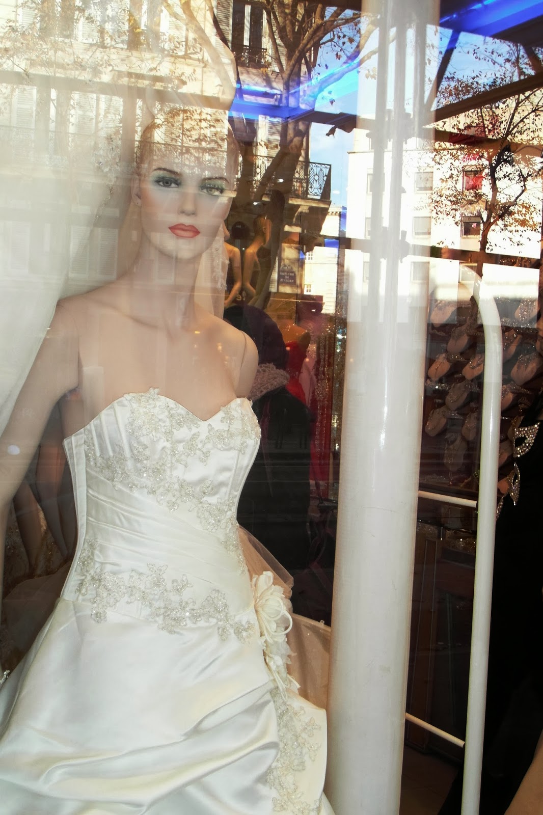 | Paris, shop window displays near Montmartre showing the latest fashions for wedding clothes, including a bride who looks more like a tragedy queen! |
