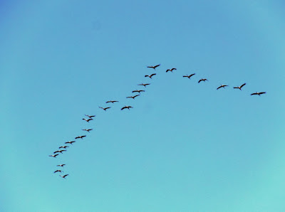 | Cranes (gruidae) are large, long-legged, long-necked birds. They fly with their necks outstretched, and live on all continents except Antarctica and South America. They eat a range of items and are opportunistic feeders, sometimes insects, fish, small rodents, amphibians, various plants, acorns, grains and berries. Only certain cranes migrate travelling thousands of miles each year from their breeding sites. They have a wide vocabulary of specialised calls, flying in an echelon (arrow format) at speeds of up to 50 mph. Thousands of Common cranes fly South from Scandinavia spending time at two Northern French lakes, Der-Chantecoq and La Champagne. They cross France diagonally via Nievre flying toward Aquitaine then cross the Pyrenees toward Southern Spain or Portugal. In the photographs above cranes are flying over Creuse. I have seen many thousands of cranes this year and feel very lucky to live on the crane flight path. |