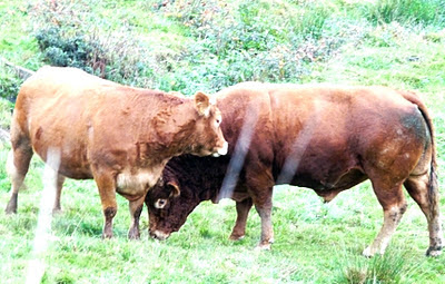 A young Limousin bull takes a liking to a particular cow. She appears to be already pregnant.