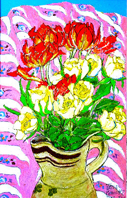 Birthday flowers, yellow roses and orange tulips, painting by Tessa Bennett.
